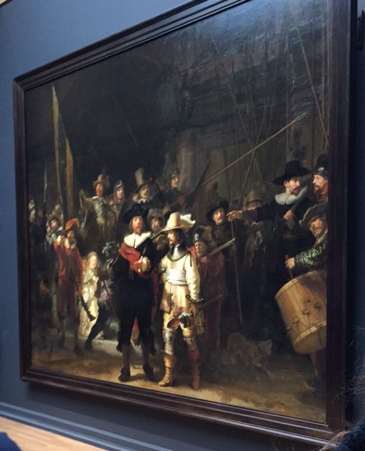 Toen ik met mijn ouders naar het rijksmuseum ging, was ik erg nieuwsgierig naar de beroemde Nachtwacht. Je hoort er zo veel over en ze maken er reclame over op tv. Toen ik de nachtwacht voor het eerst zag, had ik even een stilte momentje. Zo groot maar zo bijzonder. Er valt genoeg te bekijken. Eerst gaan je ogen naar de man in het witte ridderpak. De man er naast valt je daarna op. Je ogen gaan niet alleen naar die man, maar ook naar het meisje in de witte jurk, links achter. Zij was de mascotte van de hele groep. Als je er lang genoeg naar kijkt, valt je steeds meer dingen op. Ieder persoon is apart geschilderd met ieder een aparte functie. De een laadt zijn geweer, de ander is bezig om de vlag in de lucht te houden etc. Dat maakt de nachtwacht ook bijzonder van de andere schilderijen met mensen erop. Het is niet saai, iedereen is bezig en iedereen is apart geschilderd. Er is veel actie. Ik vind de Nachtwacht bijzonder mooi.